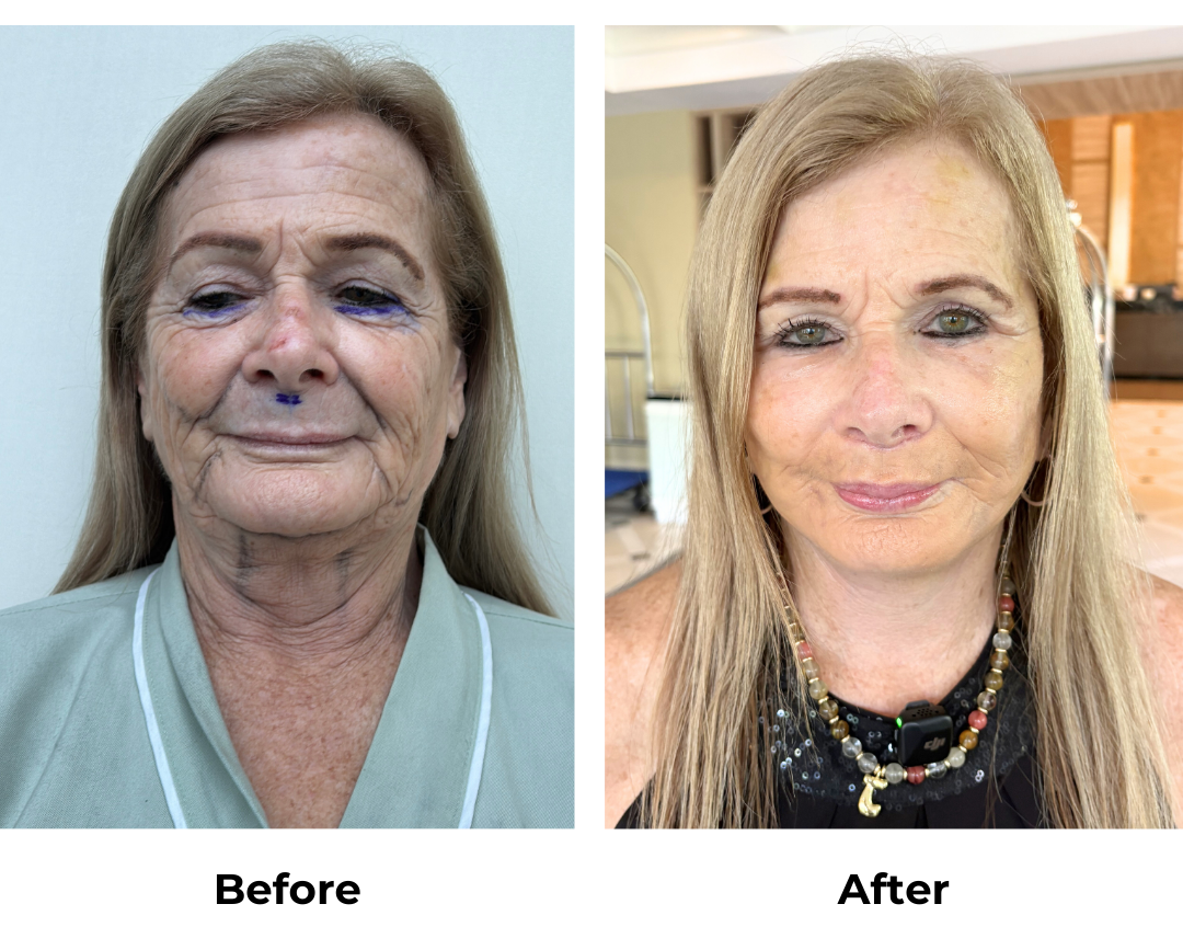 The Full Facelift helped lift and reposition the deeper tissues of the face, improving the contour of her cheeks and jawline. The Neck Lift and Platysmaplasty tightened the muscles and skin of the neck to create a smoother and more defined profile. To restore lost volume, fat transfer to the face was performed using Jennifer’s own purified fat, helping soften facial lines and improve overall balance. An Upper Lip Lift was also performed to refine the lip area and enhance facial harmony.